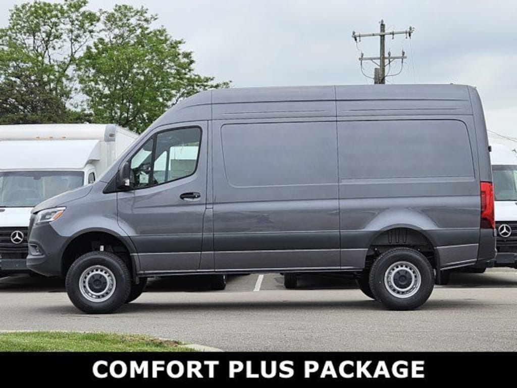 This 2025 Mercedes-Benz Sprinter 2500 comes with following features: All Wheel Drive Package, 16" x 6.5J Steel Wheels, 3.923 Axle Ratio, 4-Wheel Disc Brakes, 5 Speakers, ABS brakes, Air Conditioning, AM/FM radio, Armrest for Driver's Seat, Bodyside moldings, Brake assist, Driver door bin, Driver's Seat Mounted Armrest, Dual front impact airbags, Dual front side impact airbags, Electronic Stability Control, Emergency communication system, Exterior Parking Camera Rear, Front anti-roll bar, Front Bucket Seats, Front wheel independent suspension, Fully automatic headlights, Heated door mirrors, Heated Driver's Seat, Heated front seats, Illuminated entry, Low tire pressure warning, Outside temperature display, Overhead airbag, Overhead console, Passenger door bin, Passenger seat mounted armrest, Power door mirrors, Power steering, Power windows, Radio: Standard, Rain sensing wipers, Rear anti-roll bar, Remote keyless entry, Speed control, Speed-sensing steering, Standard Driver Seat, Standard Front Passenger Seat, Steering wheel mounted audio controls, Tachometer, Tilt steering wheel, Traction control, and Variably intermittent wipers.