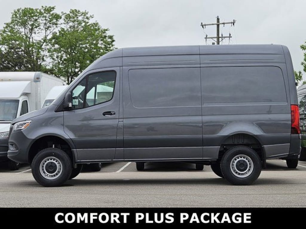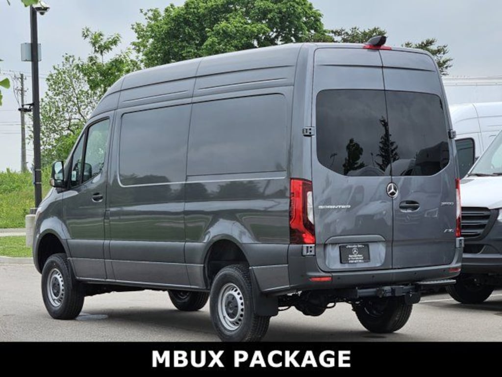 This 2025 Mercedes-Benz Sprinter 2500 comes with following features: All Wheel Drive Package, 16" x 6.5J Steel Wheels, 3.923 Axle Ratio, 4-Wheel Disc Brakes, 5 Speakers, ABS brakes, Air Conditioning, AM/FM radio, Armrest for Driver's Seat, Bodyside moldings, Brake assist, Driver door bin, Driver's Seat Mounted Armrest, Dual front impact airbags, Dual front side impact airbags, Electronic Stability Control, Emergency communication system, Exterior Parking Camera Rear, Front anti-roll bar, Front Bucket Seats, Front wheel independent suspension, Fully automatic headlights, Heated door mirrors, Heated Driver's Seat, Heated front seats, Illuminated entry, Low tire pressure warning, Outside temperature display, Overhead airbag, Overhead console, Passenger door bin, Passenger seat mounted armrest, Power door mirrors, Power steering, Power windows, Radio: Standard, Rain sensing wipers, Rear anti-roll bar, Remote keyless entry, Speed control, Speed-sensing steering, Standard Driver Seat, Standard Front Passenger Seat, Steering wheel mounted audio controls, Tachometer, Tilt steering wheel, Traction control, and Variably intermittent wipers.