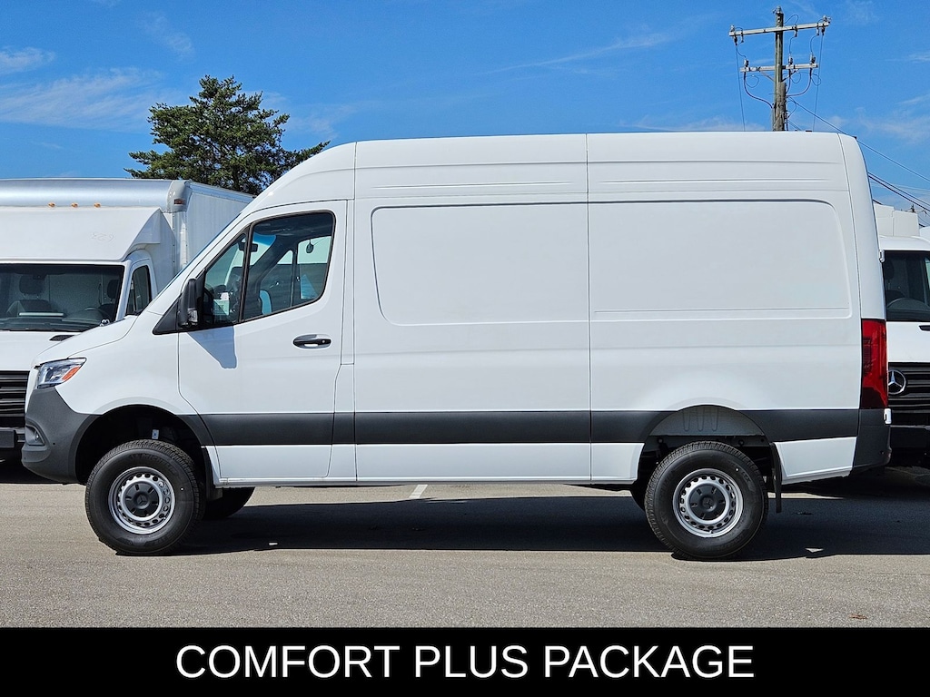 This 2025 Mercedes-Benz Sprinter 2500 comes with following features: All Wheel Drive Package, 16" x 6.5J Steel Wheels, 3.923 Axle Ratio, 4-Wheel Disc Brakes, 5 Speakers, ABS brakes, Air Conditioning, AM/FM radio, Armrest for Driver's Seat, Bodyside moldings, Brake assist, Driver door bin, Driver's Seat Mounted Armrest, Dual front impact airbags, Dual front side impact airbags, Electronic Stability Control, Emergency communication system, Exterior Parking Camera Rear, Front anti-roll bar, Front Bucket Seats, Front wheel independent suspension, Fully automatic headlights, Heated door mirrors, Heated Driver's Seat, Heated front seats, Illuminated entry, Low tire pressure warning, Outside temperature display, Overhead airbag, Overhead console, Passenger door bin, Passenger seat mounted armrest, Power door mirrors, Power steering, Power windows, Radio: Standard, Rain sensing wipers, Rear anti-roll bar, Remote keyless entry, Speed control, Speed-sensing steering, Standard Driver Seat, Standard Front Passenger Seat, Steering wheel mounted audio controls, Tachometer, Tilt steering wheel, Traction control, and Variably intermittent wipers.
